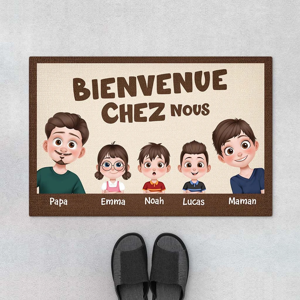 Bienvenue Chez Nous Design Cartoon Version Famille – Cadeau Personnalisé | Paillasson Pour Famille
